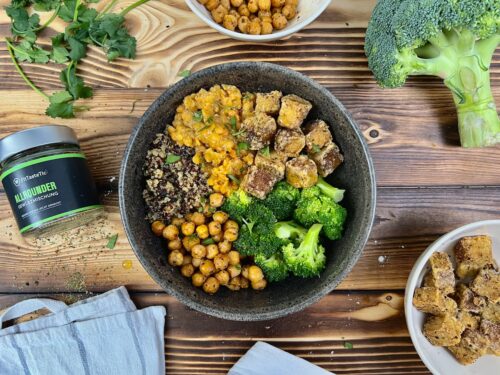 Diese leckere Bowl ist gefüllt mit gesunden Zutaten, die nicht nur vegan sind, sondern auch noch richtig proteinreich. Vom marinierten Tofu bis hin zum Brokkoli. Einfach köstlich.